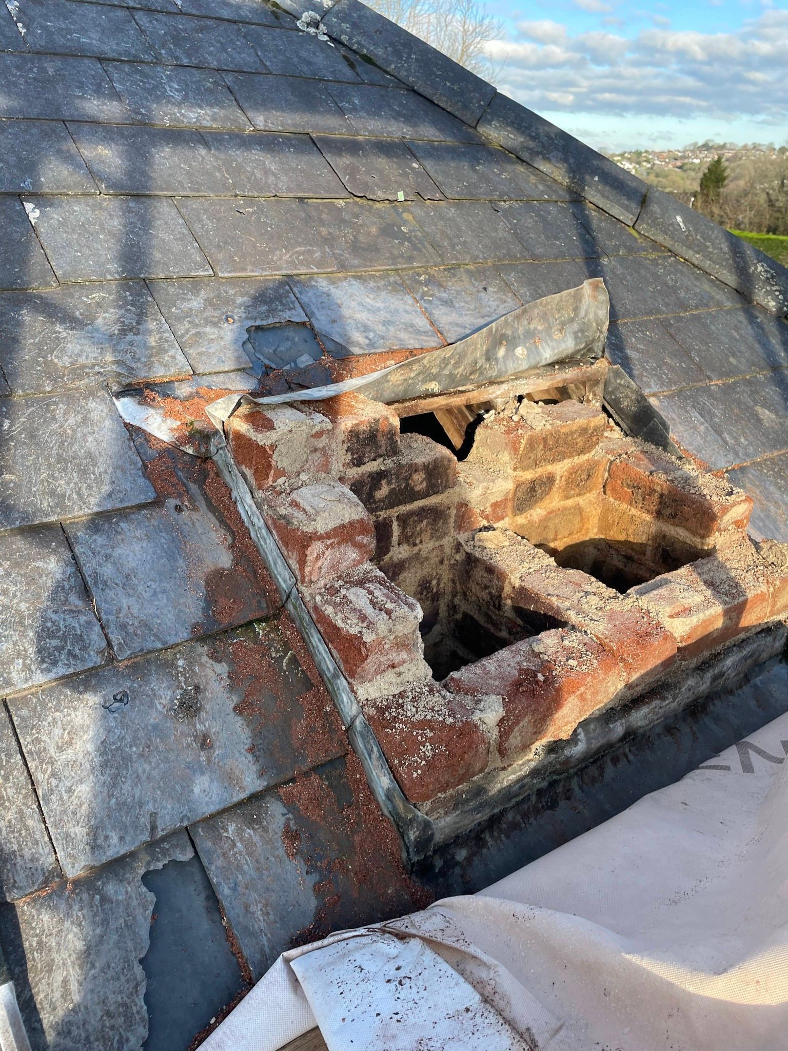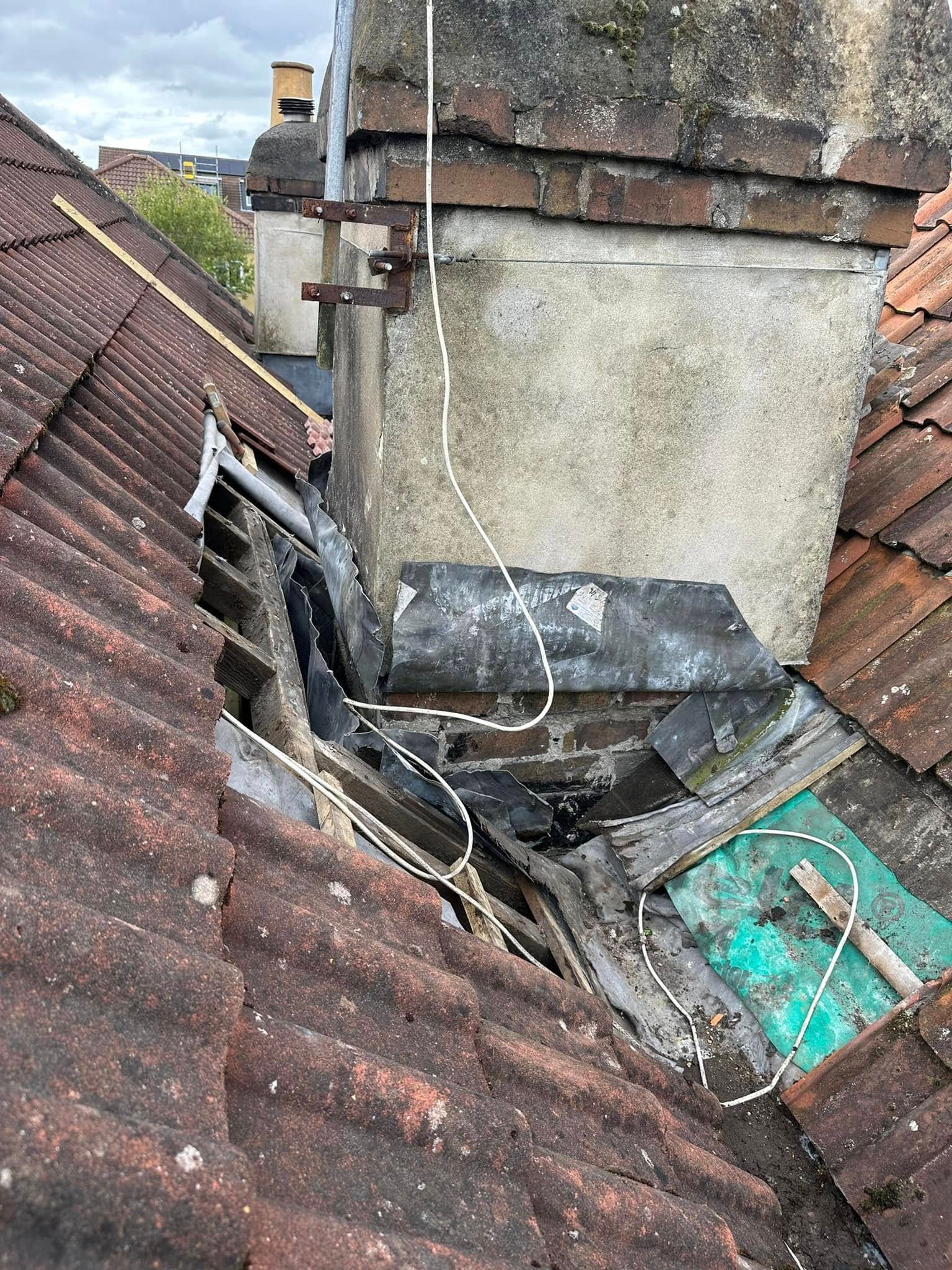 - Damaged or detached lead flashing around chimney stacks, skylights, or party walls